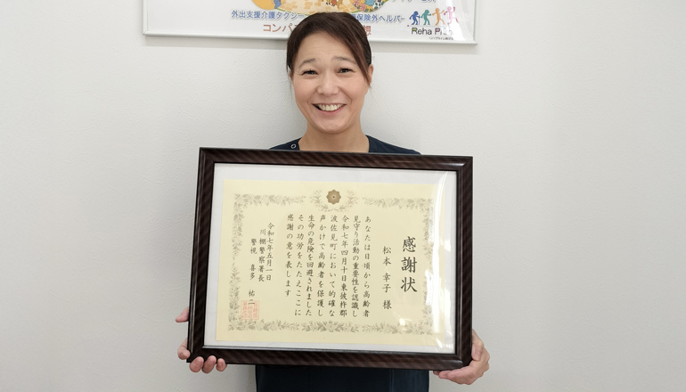高齢の女性を保護し、人命救助に貢献した弊社代表・松本が、5月1日、川棚警察署長より感謝状をいただきました。4月10日、長崎県東彼波佐見町の県道を車で通勤途中に高齢女性が右足に室内スリッパ、左足は靴下だけで歩いているのを目撃。違和感から声掛けをし女性を保護、交番に送り届けました。